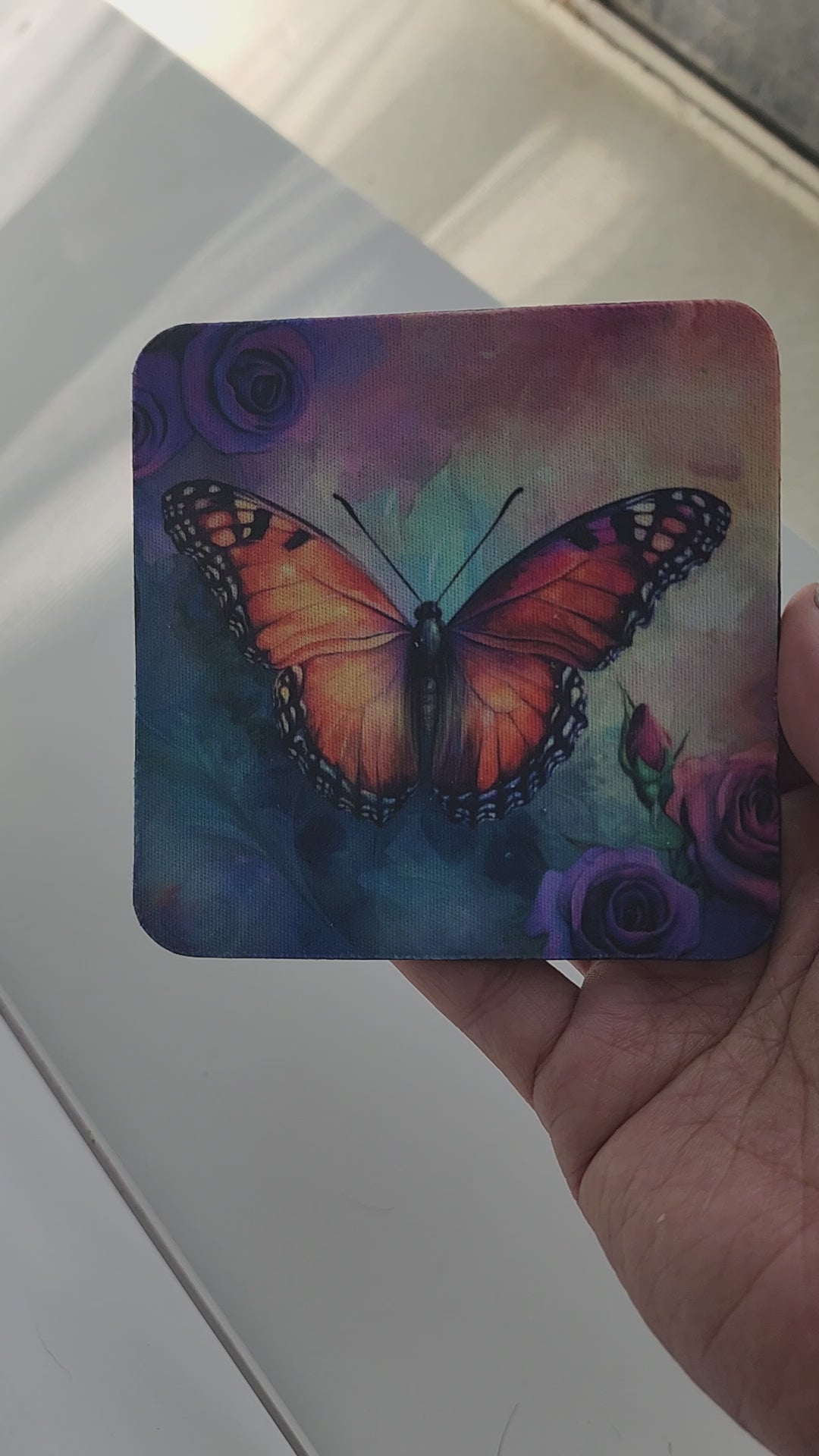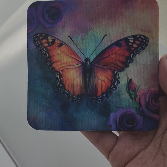 Transform your coffee table with these enchanting butterfly coasters that bring a touch of natural beauty to your home decor. Each coaster in this set of four features a stunning monarch butterfly design rendered in vibrant orange hues, gracefully poised against a dreamy background of blue and pink watercolor effects. The artistic composition is further enhanced by delicate purple roses scattered throughout the design. Perfect for protecting your furniture while adding an artistic flair, these coasters make an ideal addition to any room. The durable construction ensures they'll stand up to daily use while maintaining their beautiful appearance. Whether you're serving morning coffee or evening cocktails, these coasters provide both functionality and aesthetic appeal. They also make a thoughtful gift for nature lovers or anyone who appreciates beautiful home accessories. The set includes four matching coasters, offering ample protection for family gatherings or intimate conversations over drinks.
